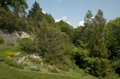 La grande rocaille couverte de végétation est le joyau du jardin.
